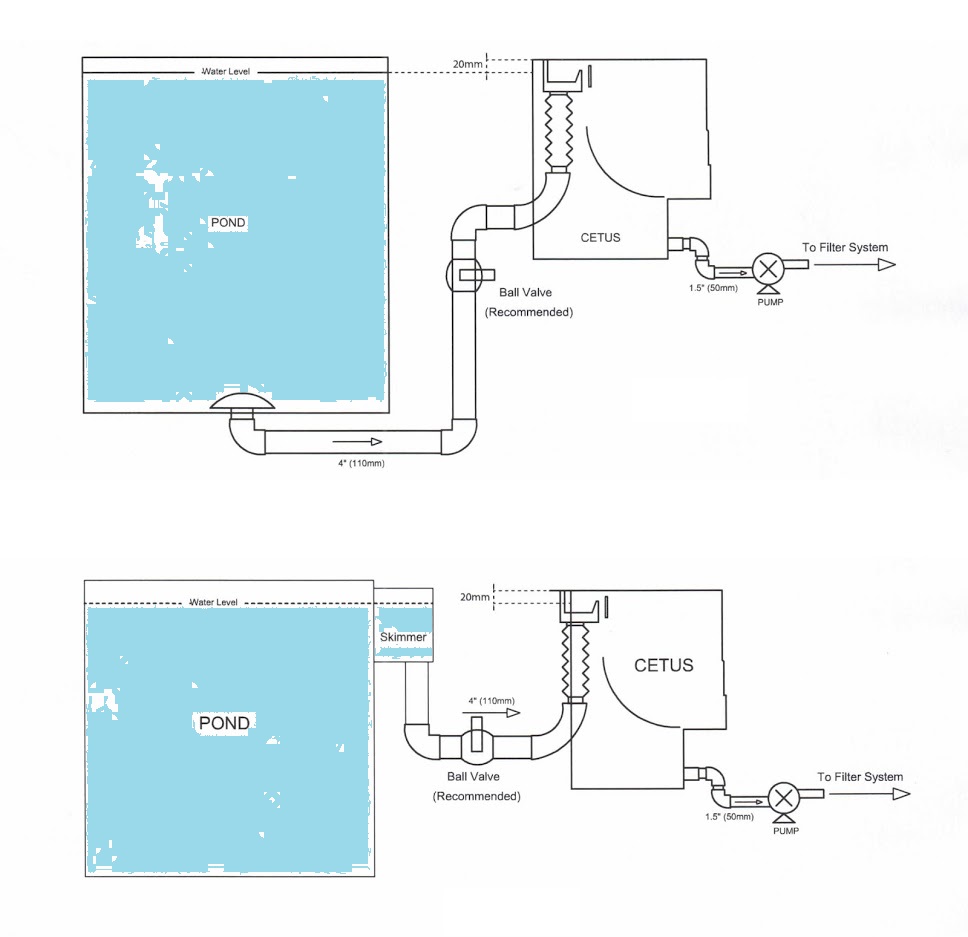 Voda samospádom priteká do štrbinovej filtrácie cez dno alebo skimer, následne smeruje do biologickej filtrácie, ktorá je umiestnená buď v šachte alebo nad hladinou vody.